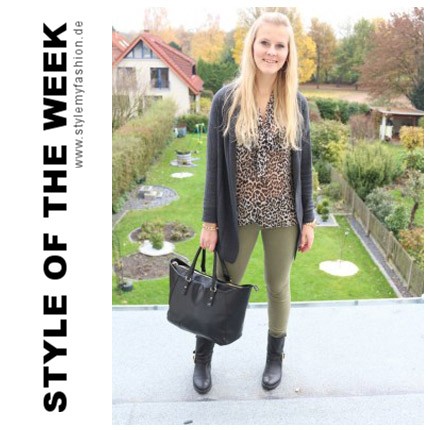 Dabei setzt sie auf den immer wiederkehrenden Leo-Print-Trend. Versehen ist die transparente Bluse mit einer süßen Schleife. Damit der Look nicht überladen wirkt, trägt Kristina eine einfarbige, schlichte khakifarbene Hose. Die flachen, schwarzen Boots im Biker-Look und die schwarze Tasche verleihen dem Outfit eine coole Note. Und durch den Cardigan wird Kristina während der kälteren Tage auch nicht frieren müssen.