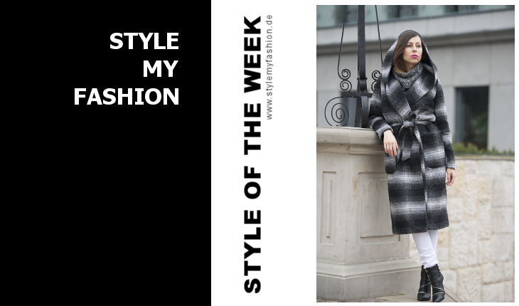 Mon Cherries trägt einen grauen, lockeren Rollkragenpullover und dazu einen passenden dicken, schwarz-weißen Mantel. Dieser zieht die Blicke auf sich, denn er besitzt eine riesige, elegant geschnitte Kapuze sowie Schnüre, zum Hervorheben der Taille. Der Pulli wirkt auf den ersten Blick, wie ein Schal, da er den Mantelauschnitt perfekt bedeckt. Zu diesen zwei Styleelementen wählt unsere Stylistin eine weiße Skinnyjeans, die sich dem Farbschema des restlichen Outfits einwandfrei anpasst. Eine Besonderheit der Fashionkreation sind die schwarzen Stiefeletten, welche weiße Streifen besitzen. Sie wirken äußert stilvoll und verzieren das zeitlose Outfit. Der Look von Mon Cherries könnte man auch der Stilrichtung monochrom zuordnen, da ihre Farben hauptsächlich aus schwarz-weiß bestehen und nur durch leichte Grauakzente aufgelockert werden.
