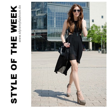 Das schwarze Kleid von The L Fashion besticht nicht nur durch seine seitlichen Ausschnitte, sondern auch durch seine unterschiedliche Länge, die im hinteren Teil eine Art "Schleppe" bildet. Sonnenbrille, Handtasche, etwas Schmuck und ein Paar tolle High Heels komplettieren den sommerlichen Look.