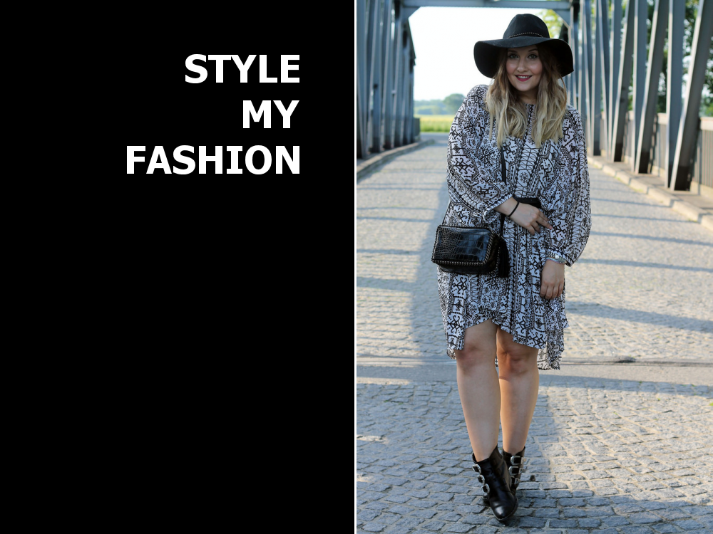 mein erster sommerlook mit gemustertem kleid in schwarz und weiß. dazu trage ich boots und einen hut.