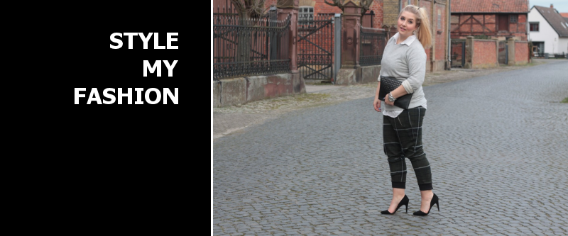 meine neue sweatpants in khaki schwarz kariert. dazu eine weiße bluse und ein grauer sweater. pumps strecken den look etwas