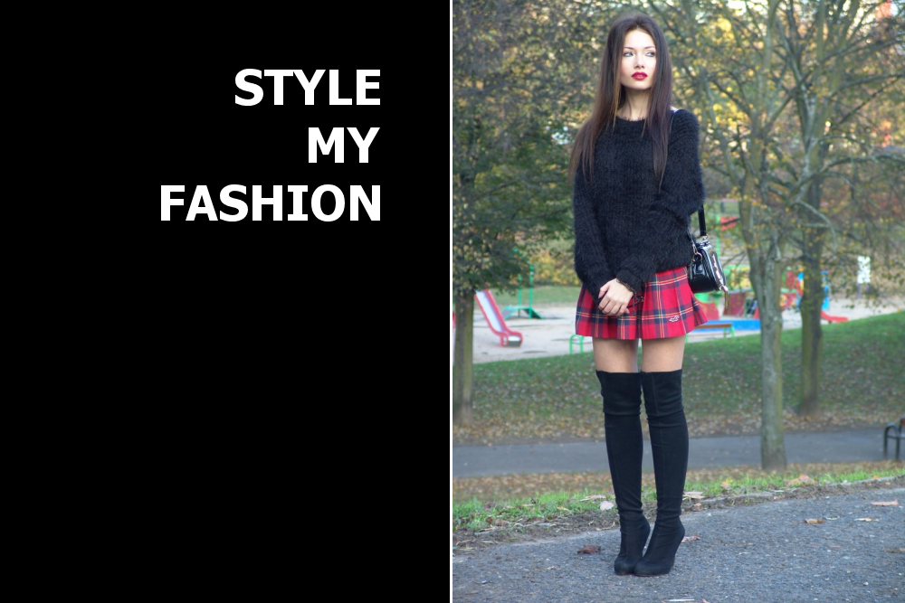 Black, fluffy sweater paired with tartan skirt and over the knee boots.
