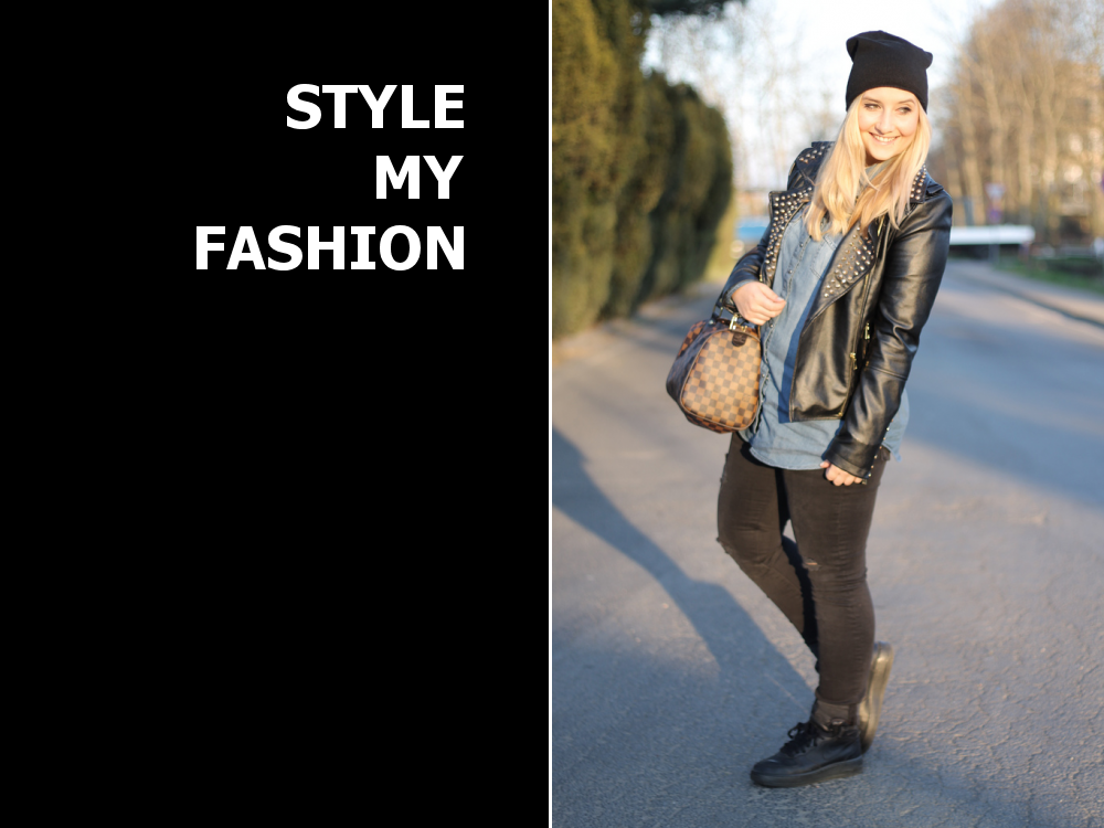 mal ein ungewöhnlich sportlicher look von mir, mit schwarzen nike air force, schwarzer destroyed jeans, jeanshemd und lederjacke mit goldenen nieten.