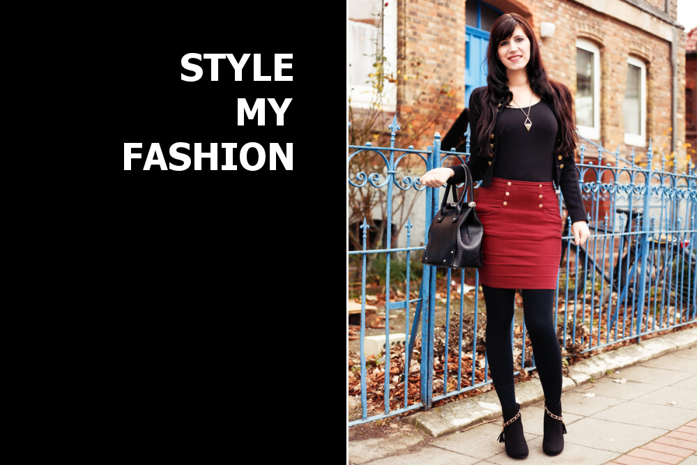 Farbliche Gestaltung bei Style-Element "weinroter Rock mit goldenen Knöpfen"