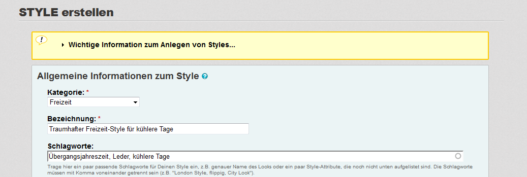 - Gib solche Schlagwörter an, die den Style möglichst gut beschreiben und von denen Du denkst, dass sie gebräuchlich sind (z.B. Retro-Style, City-Life).