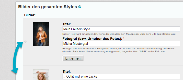 - Ordne die Bilder durch Verschieben so an, dass sich das beste Bild oben befindet. Dieses Bild ist das Hauptbild des Styles und wird zu sehen sein, wenn Dein Style in Listen und Übersichten angezeigt wird. Du kannst die Reihenfolge der Bilder ganz einfach ändern, indem Du die Bilder nach oben oder unten in der Liste verschiebst.